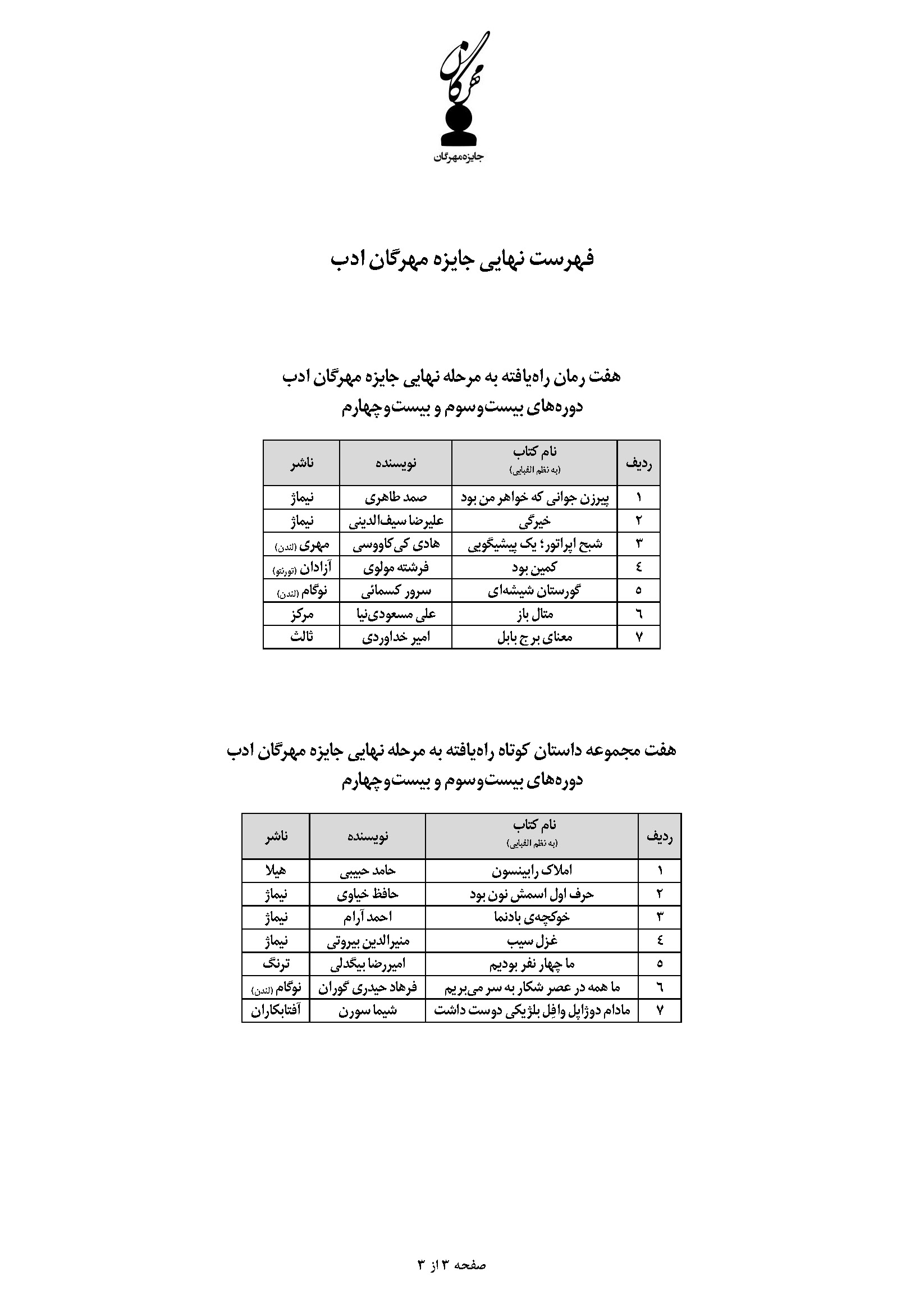 دبیرخانه جایزه مهرگان فهرست 7 رمان و 7 مجموعه داستان کوتاه راهیافته به مرحله نهایی دورههای بیستوسوم و بیستوچهارم جایزه مهرگان ادب را اعلام کرد.