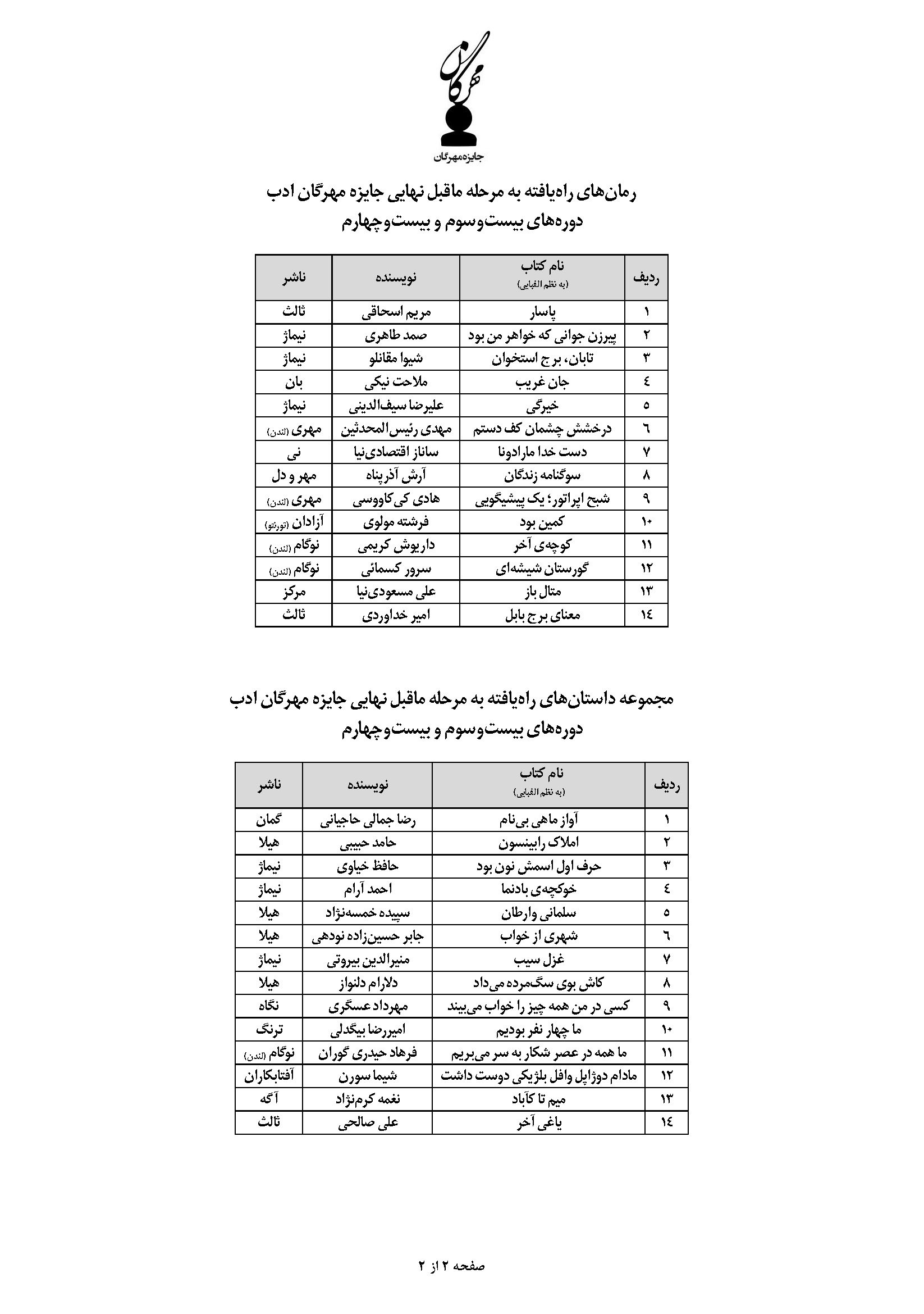 ۱ - رمان های راهیافته به مرحله ماقبل نهایی جایزه مهرگان ادب